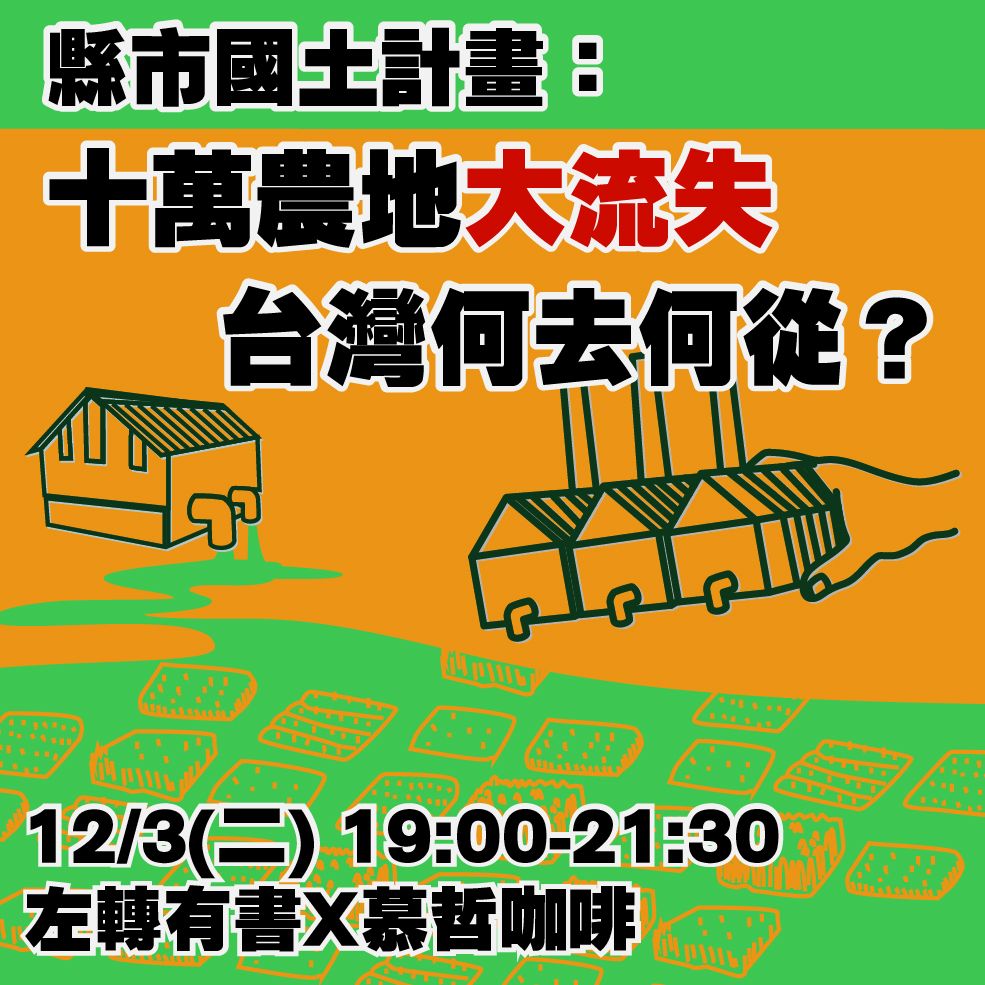 我們將於12/3於台北舉辦講座說明現況,邀請民間團體共同討論國土計畫下農地流失的對策。誠摯邀請關心台灣環境與土地的您,一起來關注,參與行動!