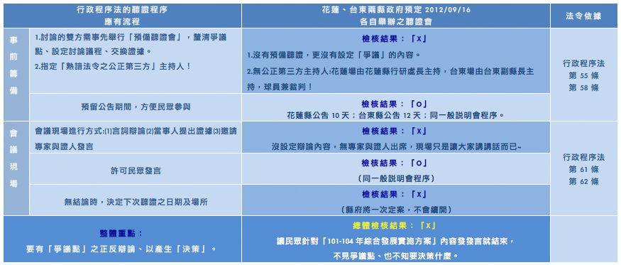 聽證會,就是「有爭議點」才要舉辦!「行政聽證」不是公聽會,更不是座談會。在嚴謹、細膩的公開討論後,它必須產生有法律強制力的「結論」!但是花東縣的「101-104年綜合發展實施方案」聽證會呢?經過檢核,這只是一個名字叫做聽證會的「公開說明會」(詳見附表)。