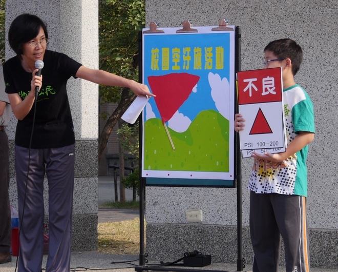 一個月後,教育部終於召開「校園空氣品質旗幟宣導試辦計畫」諮詢會議,邀請環工學者及台灣環盟劉志堅博士、環保媽媽環保基金會周春娣及地球公民基金會出席。