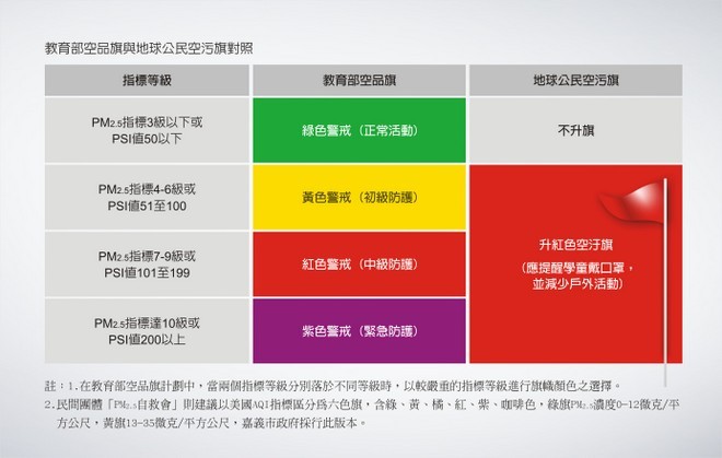 我們強烈建議空品旗計劃不應只依照環保署PM2.5指標的建議,畢竟環保署的建議是給各齡層的,教育部的空品旗計畫是給正在成長的國小學生,防護標準自應比環保署的建議更加嚴格。