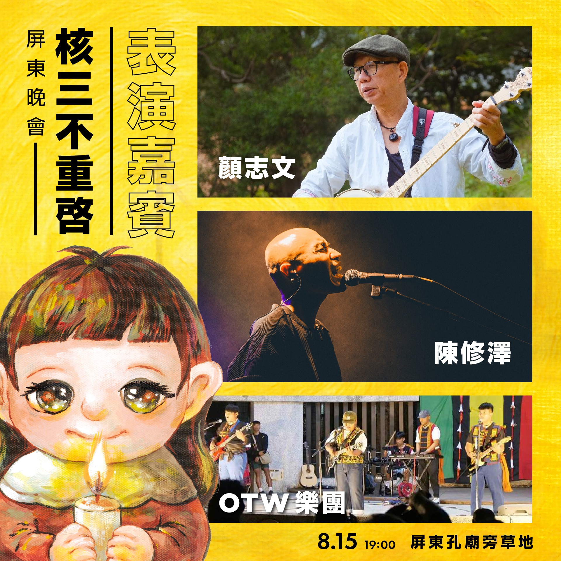 屏東、高雄、台南數十個公民團體共同舉辦屏東晚會,邀請你在8/15參與核三不重啟屏東晚會,欣賞表演、聽聽核三不該重啟的理由,一起為台灣祈福,支持屏東邁向永續、安全的未來。