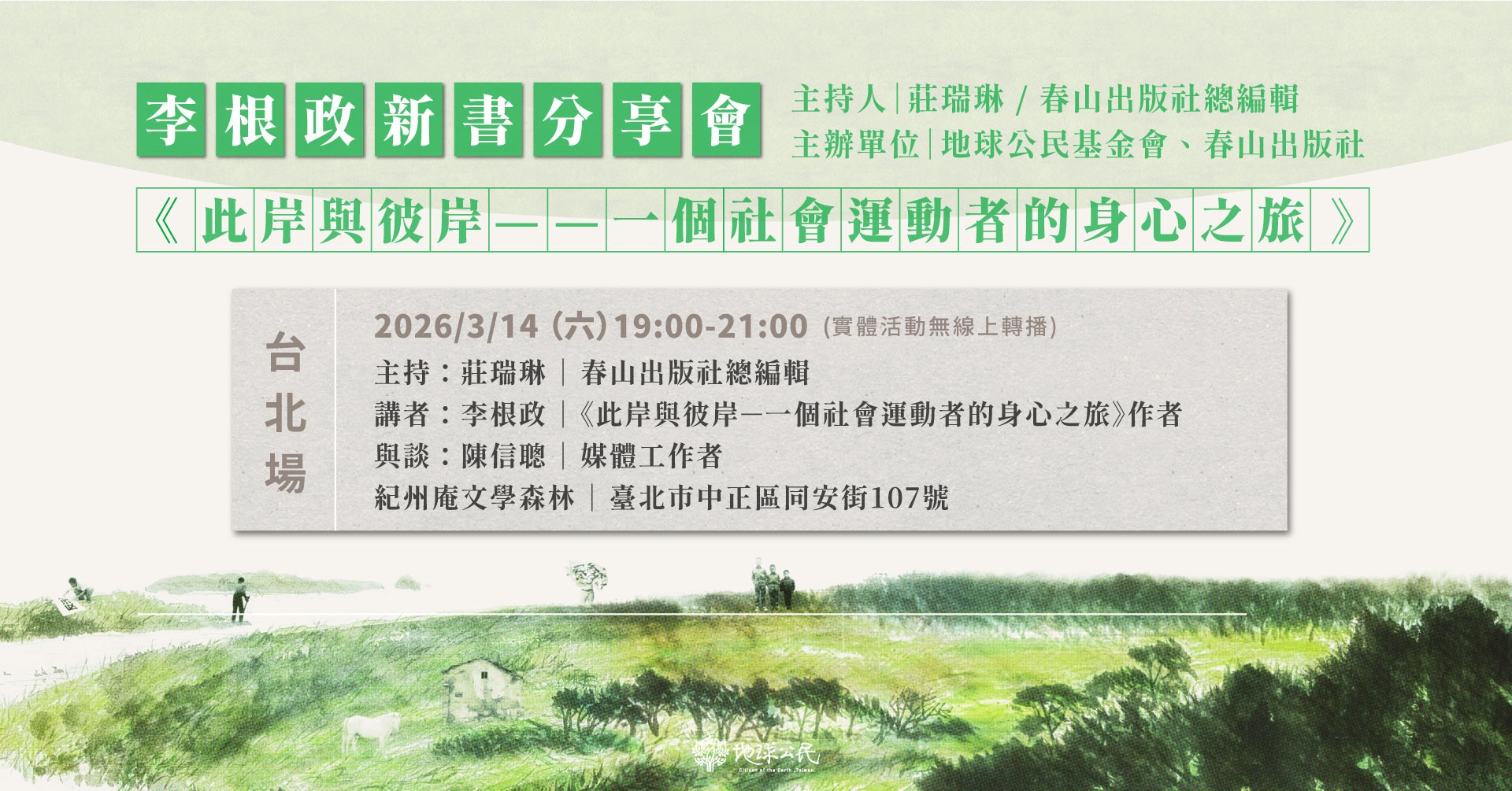 - 講者:李根政|地球公民基金會董事長、《此岸與彼岸-一個社會運動者的身心之旅》作者