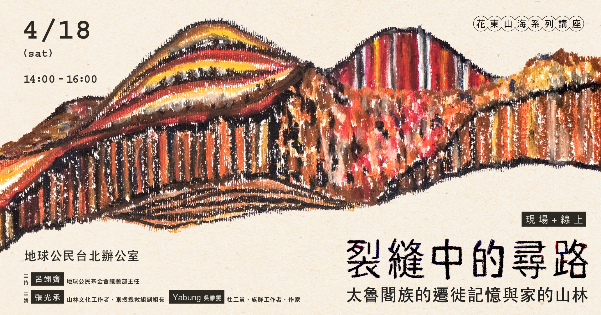 2024年的花蓮0403地震,讓更多人重新思考人與山的關係。特別是居住在這裡的族人,山林是家,是歸屬的依據,是需要持續被記憶與守護的地方。這場講座邀請兩位長期關注太魯閣文化與山林生活的分享者,從不同視角帶大家理解這片土地的故事。