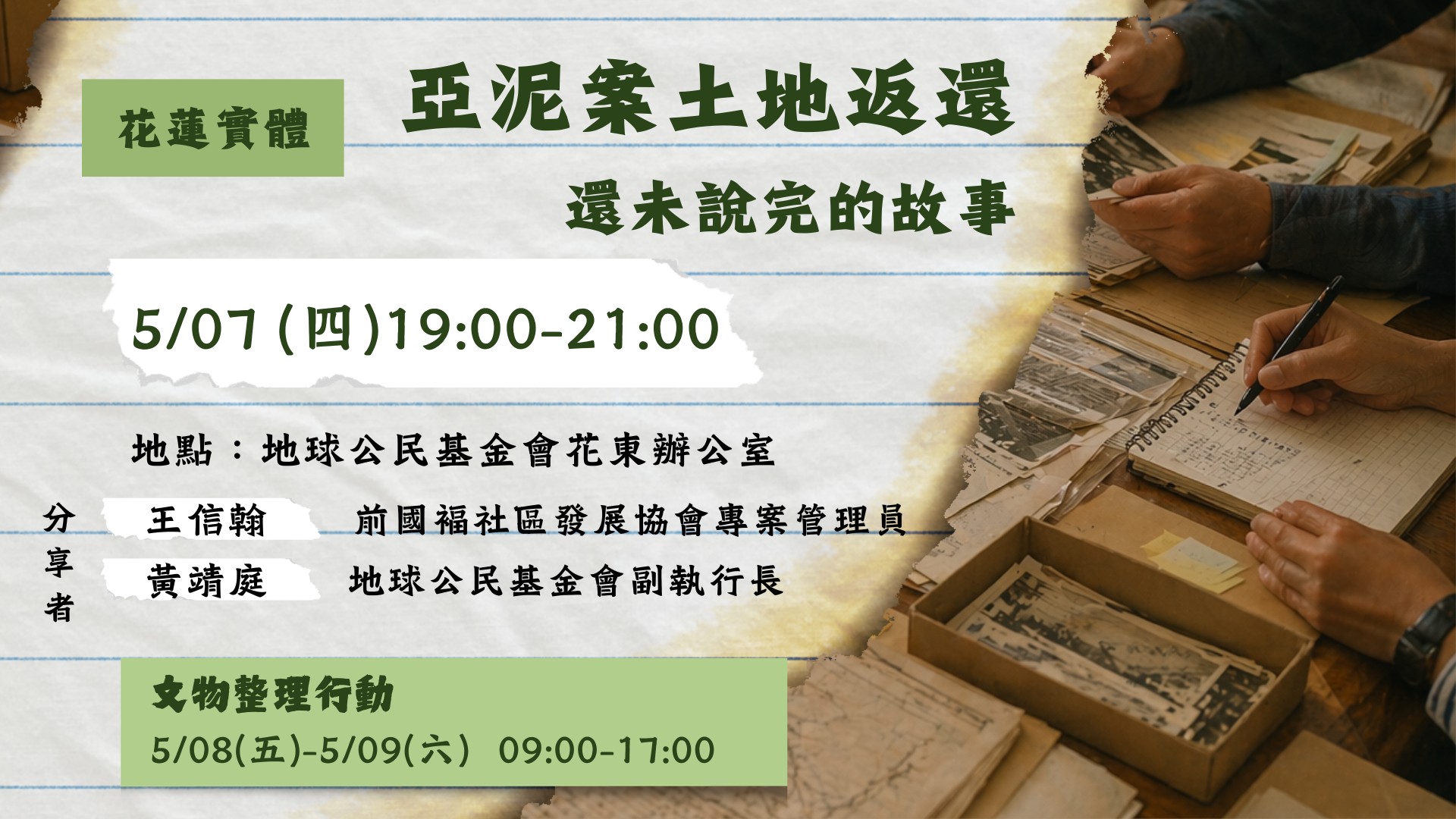 - 地點:地球公民花東辦公室(花蓮縣花蓮市自由街150號6樓之3)