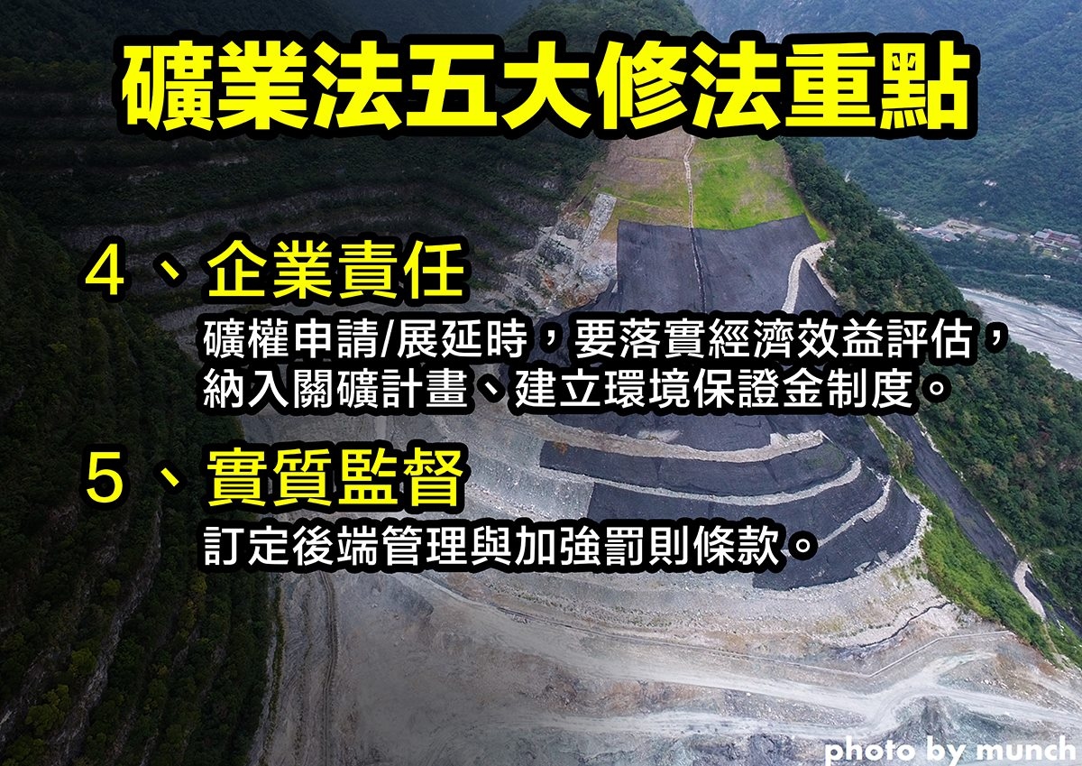 5.主管機關實質審查「礦權申請/展延」時,應落實經濟效益評估,納入關礦計畫、建立環境保證金制度。