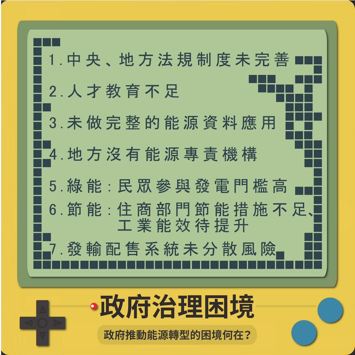 一、中央與地方能源法規未完善:未全面檢討與能源相關的所有法規是否健全,中央政府應「全面盤點」關於能源制度面的法規問題,並檢討中央政府法規制度對於能源轉型的影響,才有利於建構地方推動能源政策的法源依據。