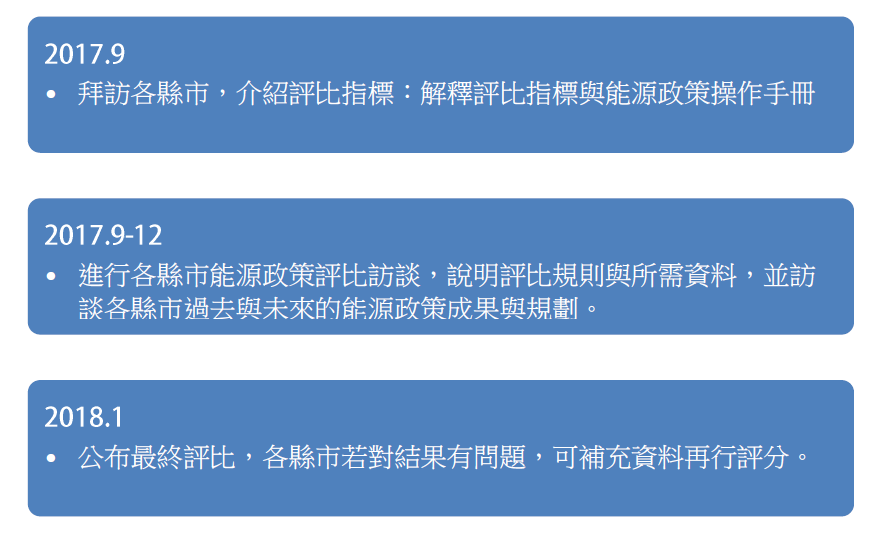 本次評比將以雙方互動的訪談方式,了解各縣市節能相關政策目前執行狀況以及未來規劃,在進行評比方式說明、以及第一階段的初步評比後,將有第二階段的評比,最終將發布第二階段的評比結果,並針對全台各縣市綜合性的評價及建議。