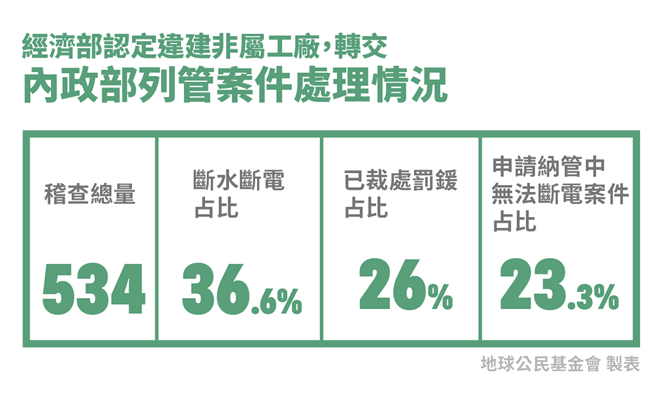 地球公民基金會山林國土組研究專員蔡佳昇表示,2020年3月20日至今年1月10日,經濟部彙整「2019年未登記工廠清查報告」及各地陳情舉報(包括地球公民農地違章工廠回報系統,代民眾舉報的469件),提出1,640家待查處的新增建農地違章工廠清單,交由地方政府查處。截至2021年12月31日,地方政府已經查處了1,443家農地違章工廠,約佔經濟部待清查名單的88%(參閱表二)。