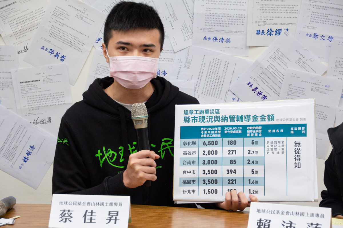 地球公民基金會山林國土組研究專員蔡佳昇要求,各地方政府應善用上億的納管輔導金,編排更多查處、輔導人力,加速查處斷水斷電,不讓廠商違法營業。(圖/地球公民基金會)