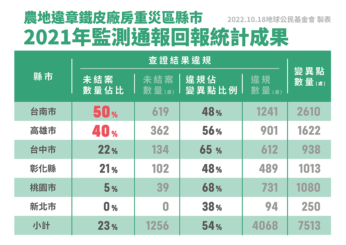 根據2021年監測通報回報統計成果,農地違章鐵皮廠房重災區縣市變異點總計7,513處,其中違規變異點有4,068處,平均高達5成4,衛星比對出的變異點有輔以現地查報之必要,但未結案違規總計1,256處,其中臺南市及高雄市高達4成以上違規查證未結案,僅有新北市完成違規查證結案,顯示出查處人力嚴重不足,即時查處效果不彰(請參閱表二)。因此,我們建議應盡速補足查處人力,讓國土利用監測計畫整合工作發揮作用,捍衛國土,遏止農地流失。