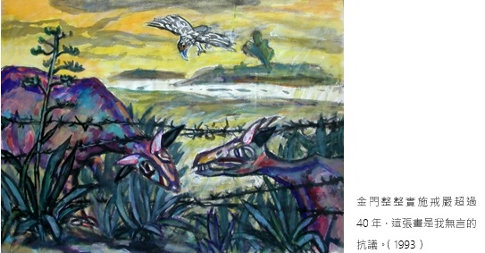 金門軍管的氣氛給我一種無孔不入的壓迫感,老家古寧頭的海邊矗立著一棟播音牆,隨時播放著鄧麗君的音樂和宣傳著「共軍止戰員弟兄們,請你們起義來歸吧!」,一直伴隨著我們到晚上10點的晚安曲,到處是不淮攝影、繪圖的禁區,對於敏感又愛好自由的人來說,這真是一種長期的精神虐待。1988年到1993年期間,我在金門過著充滿矛盾的生活,教書以外,我沈浸於古寧頭海埔地的荒野之中,埋首於藝術創作,寫著書法和畫著家鄉的風景,讀詩、書,同時也參加藝文團體、開畫展等,彷若今之古人,但是,另一方面則放不下對政治和社會關心,卻又無能將此一矛盾透過藝術創作紓解。