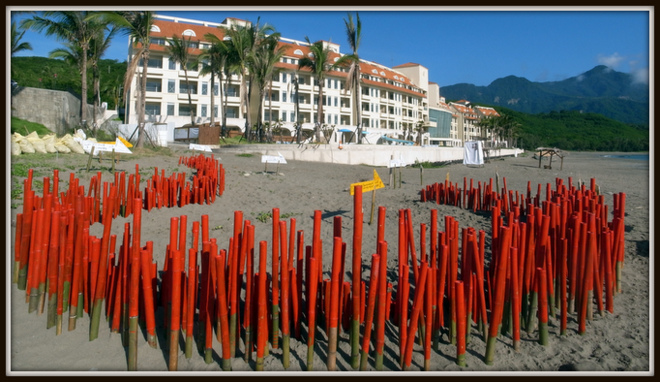八月的蘇拉颱風襲擊,海浪再次打到美麗灣現有建物的圍牆上,連帶的在沙灘上的事件展也還給大海,這些用自然素材製作的搭麓岸(註二)只是將自然還給自然,但違建的廢棄物卻再次裸露在部分掏空的沙灘上。九月十九日,第二波裝置藝術-紅色巨大問號現身沙灘,要問「在生態敏感區蓋大型建築,難道不是破壞環境嗎?」、「台東的經濟只能倚靠一間違法飯店,台東人不覺得難堪嗎?」,但美麗灣的經理卻在現場嗆聲:「我們正在上訴,你們拭目以待!」