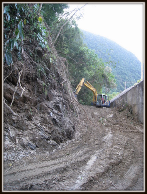 武塔社區排水水溝完全被山崩掩埋,怪手所挖出的這條路原本為排水水道,