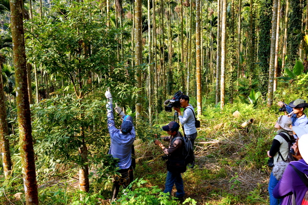 『像這棵香楠兩年前被我發現時才膝蓋高,現在已經超過兩個人。按照這速度,不出十年就會超越檳榔的高度,我想森林沒有被破壞掉之前,它應該是這裡的”王”吧。不過它不耐曬,只要裸露在陽光下超過一天頂芽就會黑掉,或許檳榔正好提供遮蔭的空間,所以才會長的那麼好。』