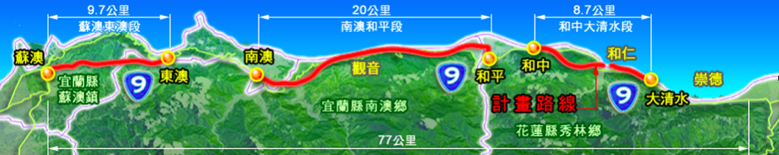 蘇花改全線計畫圖,長隧道為主要工程。A標永樂路段,原為對生態破壞較大的路提形式,經地球公民與其他關心團體多次反映已修改為高架橋,正在環保署進行環境影響差異評估。