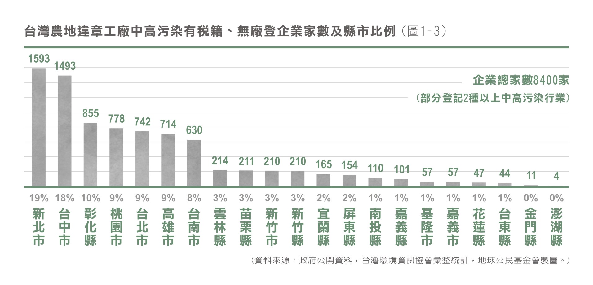 我們以一個簡略的圖像描述台灣西部農地上的困局,違章工廠一路從新北、桃園、台中、彰化、台南以及高雄,在大大小小的農地蓋滿了違章工廠。